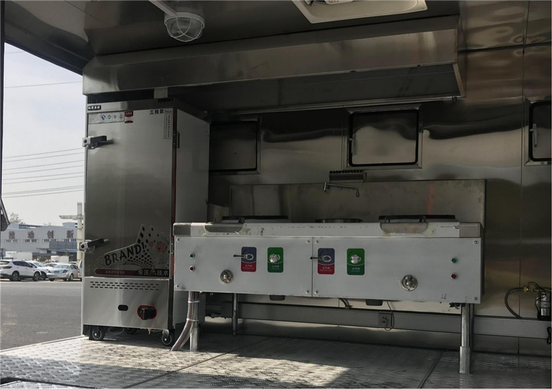 中間5CM隔熱層,箱體一側可展開作遮陽板,內置舞臺板,車頂有強排氣扇,通風散熱窗口,車廂內的設備如灶
