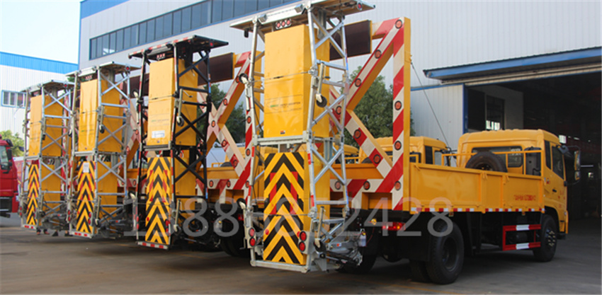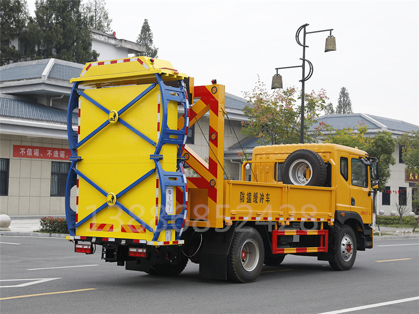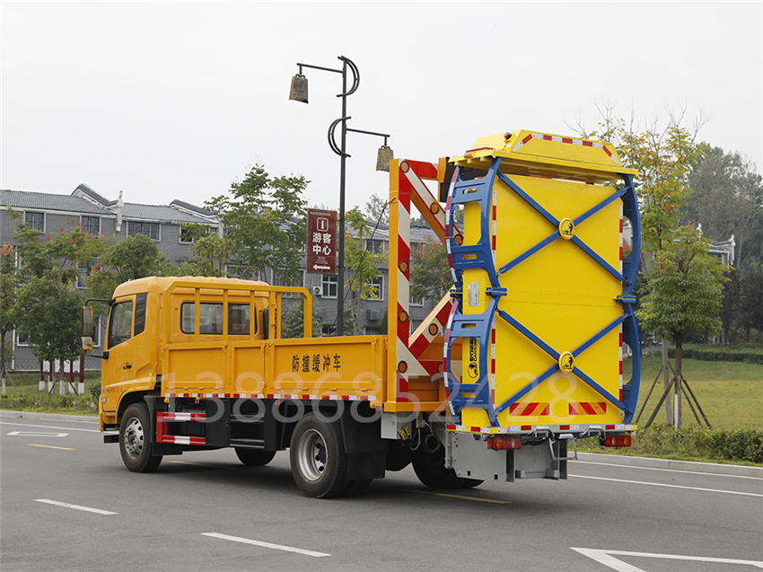 防撞緩沖車采用國六東風天錦底盤。防撞緩沖模塊升降采用液壓控制,過程平穩(wěn)、安全、機械化作業(yè)程度高,操作方便。防撞緩沖模塊整體采用國產乾行達公司技術產品100E防撞緩沖模塊,太平洋保險承保。適用于城市道路,郊區(qū)道路,高速公路,機場橋涵等場合。主要功用:置于道路施工作業(yè)人員和設 備后方,在發(fā)生追尾事故中充當肇事車輛和施工作業(yè)人員或設備的緩沖區(qū)域,并且通過自身結構變形吸收撞 擊能量,最大限度的降低施工人員或設備發(fā)生危險的幾率,同時最大限度的降低肇事車輛及人員的危險。