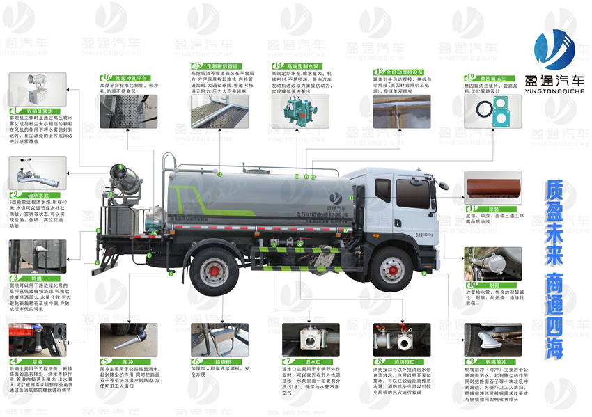 罐體材料選用武鋼優(yōu)質(zhì)材料制作,灑功能為:自吸高度≤7米,前沖后灑(灑水寬度≥14米)帶側(cè)噴,罐體后帶工作平臺(tái),平臺(tái)上安裝綠化灑水高壓炮(炮噴射形狀可調(diào)成直沖狀、大雨、中雨、毛毛雨,炮可360°旋轉(zhuǎn),水柱射程≥28米,霧狀射程≥5m),配備全國(guó)質(zhì)量評(píng)比名的大功率灑水泵(日本技術(shù)),泵可自吸自排,帶自流閥,帶消防接頭,帶消防水帶,配兩根吸水管,帶過(guò)濾裝置。罐體油漆采用金屬油漆制作,銹能力強(qiáng)。罐體顏“上白下藍(lán)”,可以噴“灑或單位名稱(chēng)”字樣。
