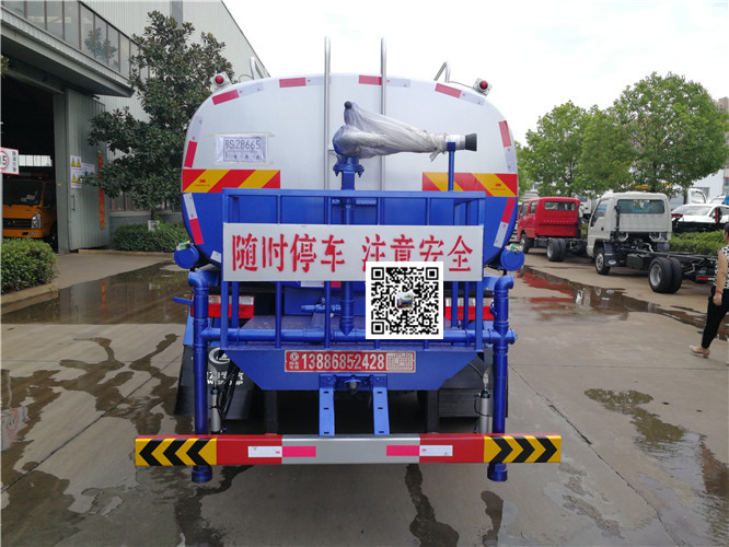 灑水車前裝有鴨形噴嘴或圓頭沖嘴,后面裝有圓柱開灑水噴嘴或蓮蓬頭噴嘴,后部有一工作平臺(tái),裝配有水炮。帶消防接頭,帶自流閥,帶自吸功能,選配20米綠化消防卷盤。