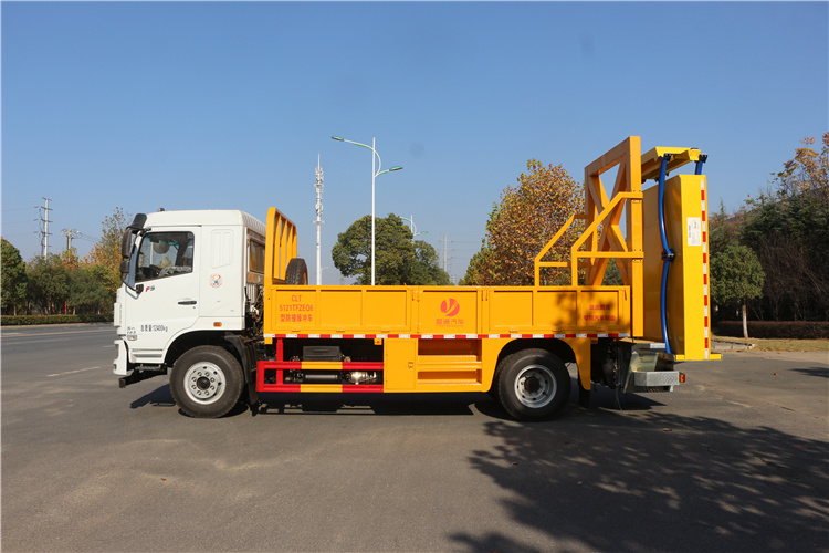 上裝配置:護箱:采用Q235國標邊3mm底板花紋板4mm厚,箱體后部防撞包采用美國進口T90型號,防撞緩沖吸能模塊主要由車載防撞緩沖墊和導向標志架組成,充當施工作業車輛后方的緩沖衛士。如若發生追尾事故,能夠在肇事車輛和前方施工作業區域之間構建一個緩沖區域,通過機具結構變形吸收撞擊的能量,最大限度地降低被保護人員及設備遭到碰撞的幾率。高性能液壓系統,可實現快速舉升和落下操作,方便設備運輸轉場,一鍵啟動功能,舉升和落下防撞裝置,當防撞裝置未完全落下到工作位置或舉升到垂直運輸位置時,會有自動警告音提示。